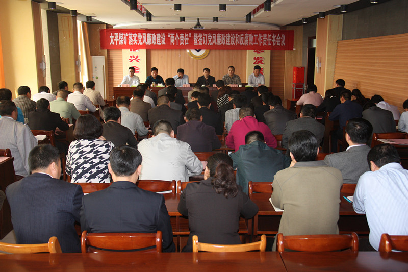 4月14日上午,太平煤矿在机关楼六楼会议室召开了落实党风廉政建设"两个责任"暨签订党风廉政建设和反腐败工作责任书会议。党委书记汤保民总结了矿2015年党风廉政建设工作情况,安排部署了2016年党风廉政建设和反腐败工作。矿长张玉标主持会议。