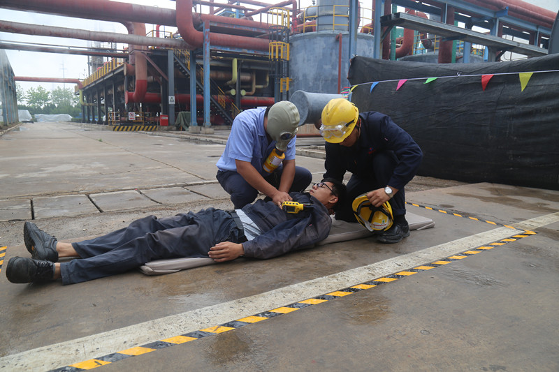 此次演练模拟"单体槽根部阀门垫片损坏泄漏,且有继续扩大趋势,时刻威胁着化工园区的安全"。演练区域内,现场人员确认泄漏点并出现轻微中毒,工段及时发出三级响应,根据风向疏散作业人员至安全区域,并打开就近消防水泡对泄漏处的氯乙烯进行冲淋稀释;车间负责人接到事故警报后及时赶赴现场查看事故详情,并启动二级预警响应。值班调度果断下达应急指令,并拨打120求救电话对中毒人员实施救援。李宝瑞接到现场事故态势报告后,将事故响应升级并启动一级预案。调度中心接到指令后将事故情况汇报给集团公司、县应急办及园区办公室;济宁市危化品应急救援中心迅速到达事故现场开展应急救援;氯乙烯现场巡检工进行倒槽操作,液位降至"0";县安监局、环保局及安委会成员同时抵达现场,组织开展救援及空气质量检测等相关工作。