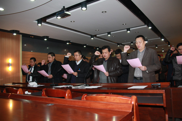 会上,纪委书记贾广海同志宣读了集团公司纪委《关于开展2013年度廉政勤政宣誓和书写廉政承诺书活动的通知》。与会人员亲笔书写了廉政勤政承诺书,并在廉政勤政承诺书上签字。党委书记刘岭同志带领与会人员面对鲜红的党旗、国旗,举起右拳,宣读了廉政勤政誓词。