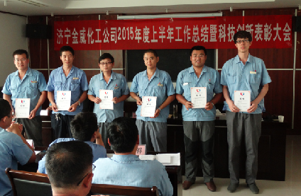 7月24日9:00,金威化工公司2015年上半年工作总结暨科技创新表彰大会在三楼会议室召开,会议传达学习了集团公司内部市场化建设推进工作会会议精神,副总经理吴艳蕊宣读了科技创新和优秀合理化建议表彰决定,对2014年度在科技创新、小改小革、合理化建议等方面表现突出的先进集体和先进个人进行表彰奖励。公司总经理申玉海出席会议并作重要讲话。
