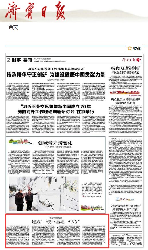 编者:10月26日出版的《济宁日报》第二版倒头条报道了集团公司“一校三基地一中心”建设工作。